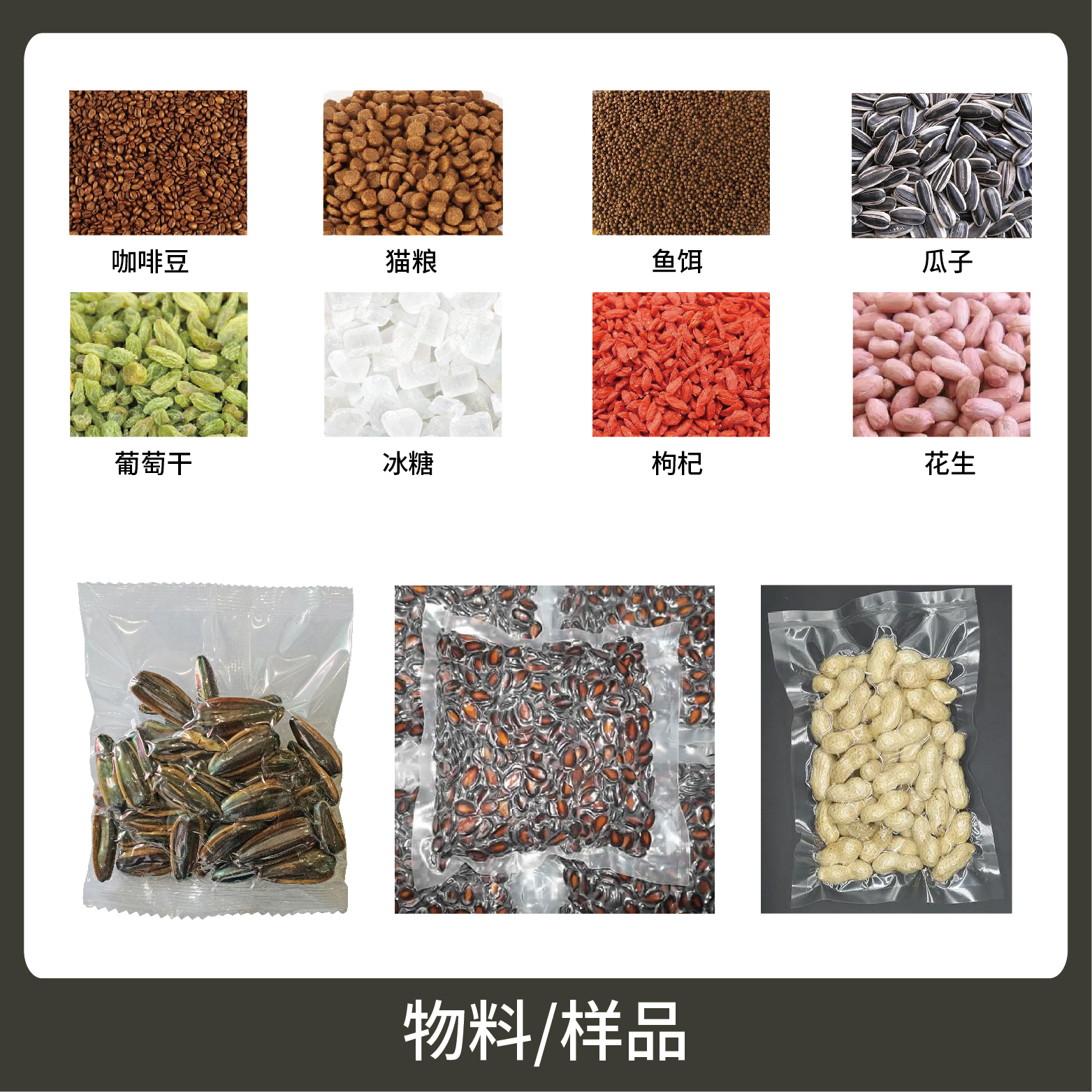 1、適用于食品行業(yè)中干果、炒貨、干菜等顆粒物品的真空計量包裝,防止食品的霉腐變質(zhì),保持食品的色香味,延長保質(zhì)期。