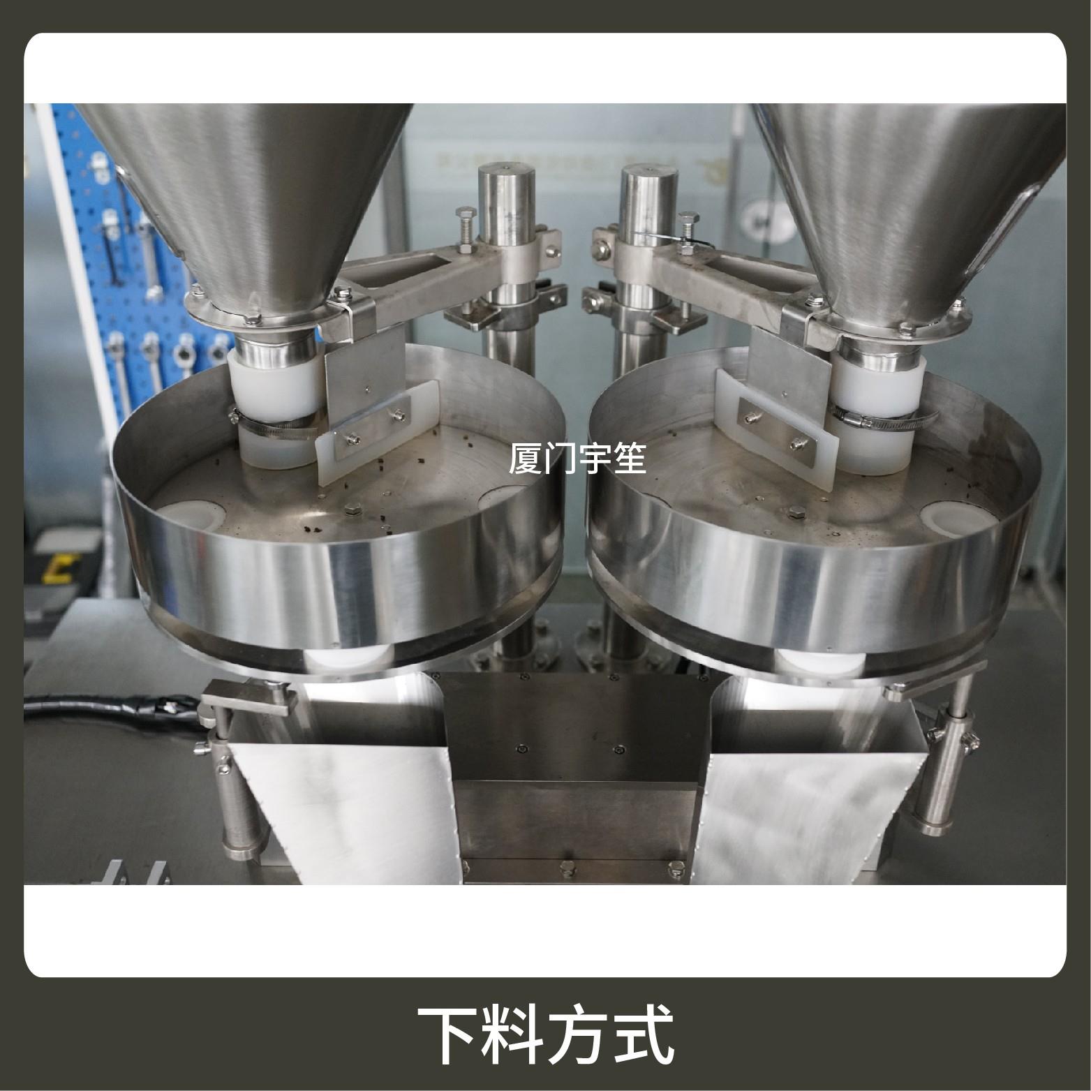1、成品雙出,速度快,包裝流程全自動,無需人工操作。可根據(jù)充填物料的性質(zhì)選配不同的下料結(jié)構(gòu)。