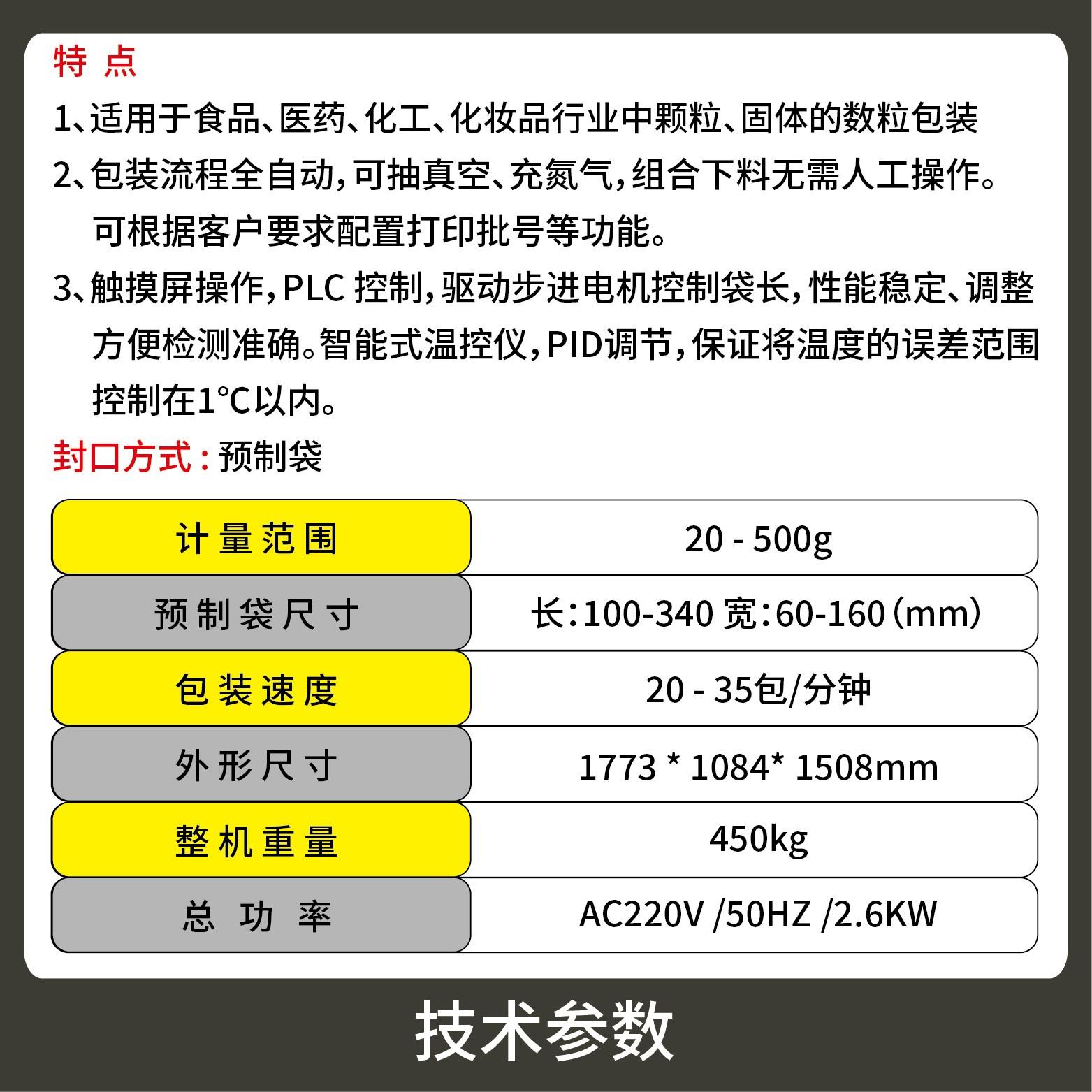 Suitable for the M-shaped bag metering and packaging of items like pet food (cat food, dog food, cat litter, etc.), snack foods (nuts, rice crackers, etc.), coffee beans, and tea leaves.